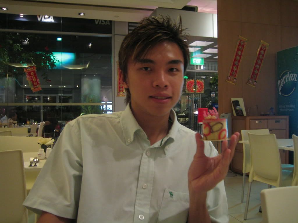 Followed by baobei's and Iris's 2 year anniversary. Big deal? Certainly it is to us since the way here isn't as smooth sailing as it was suppposed to be. This precious day falls on the 23rd of January 2006. Its my priviledge to plan this day since baobei's task is to plan Valentine's Day this year. Unfortunately, I had to work till 9pm as my supervisor, Jaslyn, swopped my schedule with hers - allowing me to have a break on cny day 3. Thus, it wasn't easy to search for a dinner place that is still open at that hour. Much efforts have to be made yah? The internet is without doubt the best aid to my problem. We ended up having our late dinner at the seven colours of the bay- The Esplanade - The Garlic Restaurant. I'd promised to bring him there since donkey years ago. Finally I kept my promise. Bought a tiny cake to surprise him.