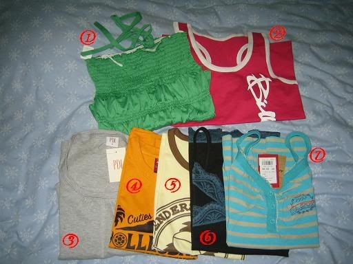 Tops for myself :1. RM10 halter top2. Bilabong Racerback3. Padini plain 3/4 sleeve top which cost only RM254. & 5. Tees RM10 each6. Samual and Kevin spag top (I bought 2 colours in sg, haven't got the black 1 yet cos out of stock in whole sg)7. Padini spag top which cost RM47